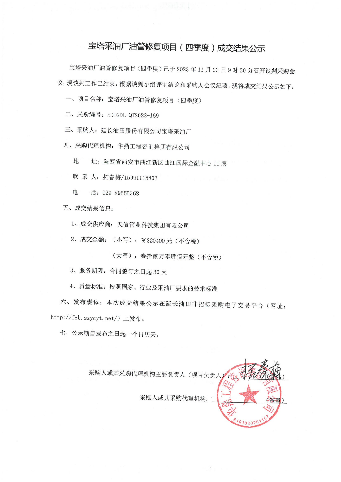 寶塔采油廠油管修復(fù)項目(四季度)成交結(jié)果公示