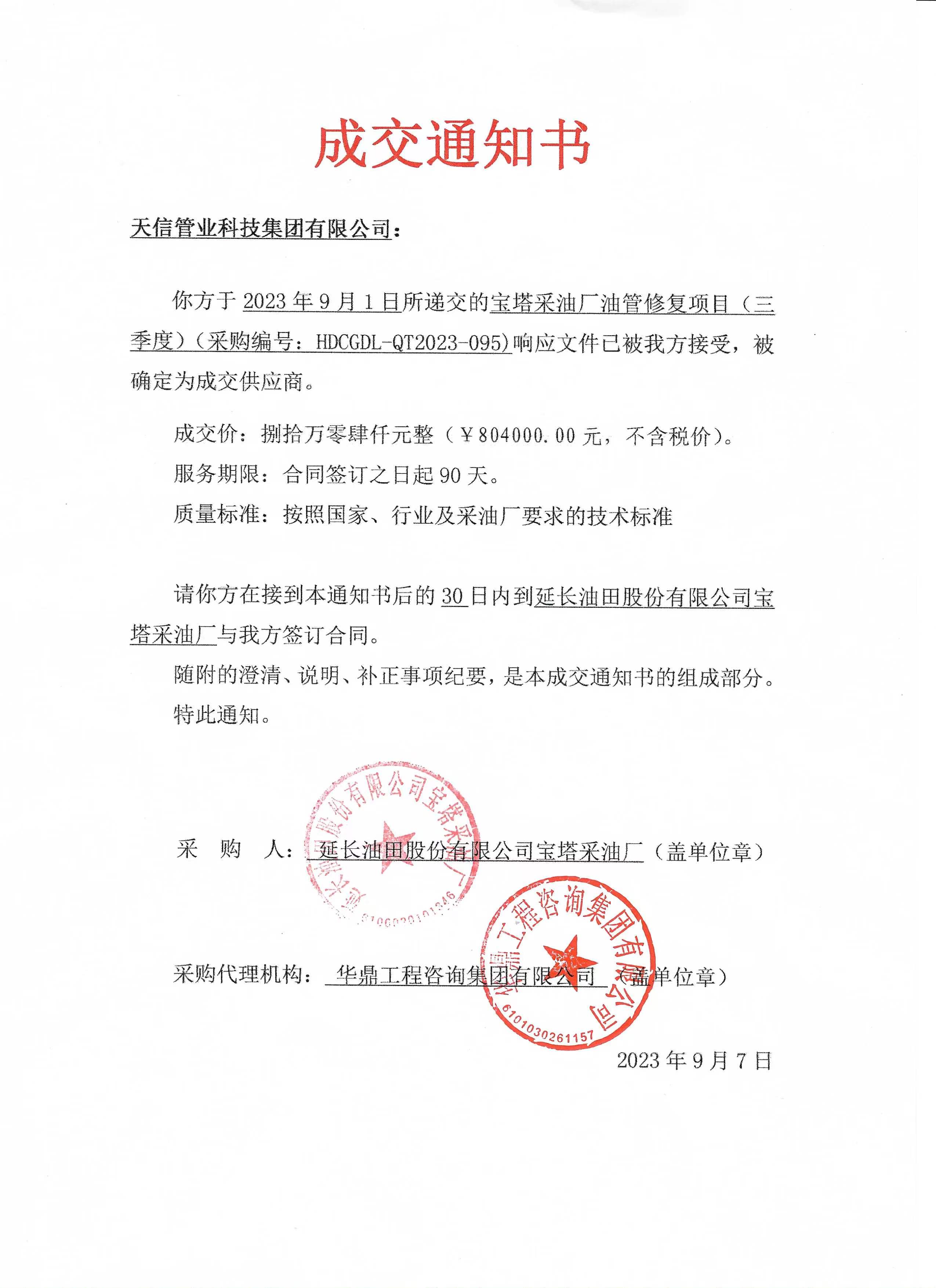 你方于2023年9月1日所遞交的寶塔采油廠油管修復(fù)項(xiàng)目(三季度)(采購(gòu)編號(hào):HDCGDL-QT2023-095)響應(yīng)文件已被我方接受,被確定為成交供應(yīng)商。