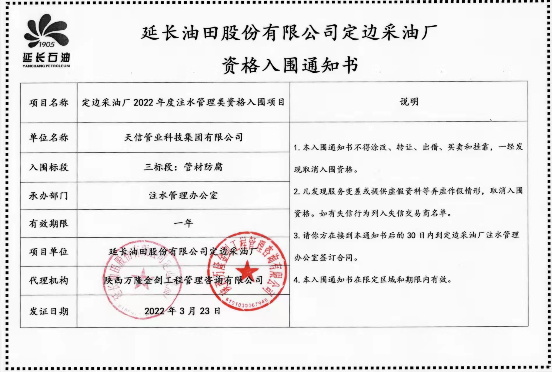 2022年3月10日,我公司投標(biāo)的定邊采油廠2022年度注水管理類(lèi)資格入圍“第三標(biāo)段管材防腐”項(xiàng)目(項(xiàng)目編號(hào)YCDCZB2021-ZR-17),在11家公司參與的激烈競(jìng)爭(zhēng)中以第一名的好成績(jī)成功入圍,這是公司實(shí)力的再次體現(xiàn),意味著我公司今后可以參與定邊采油廠注水管理類(lèi)管材防腐項(xiàng)目的招標(biāo)、建設(shè),公司全體員工表示熱烈的祝賀,祝愿銷(xiāo)售部門(mén)再接再厲,為公司的發(fā)展再創(chuàng)佳績(jī)。也希望公司各部門(mén)振奮精神,團(tuán)結(jié)協(xié)作,推進(jìn)各項(xiàng)工作再上新的臺(tái)階。